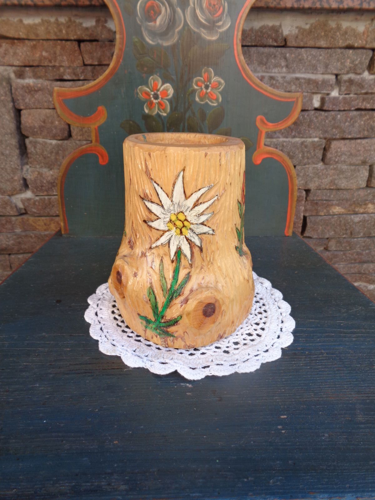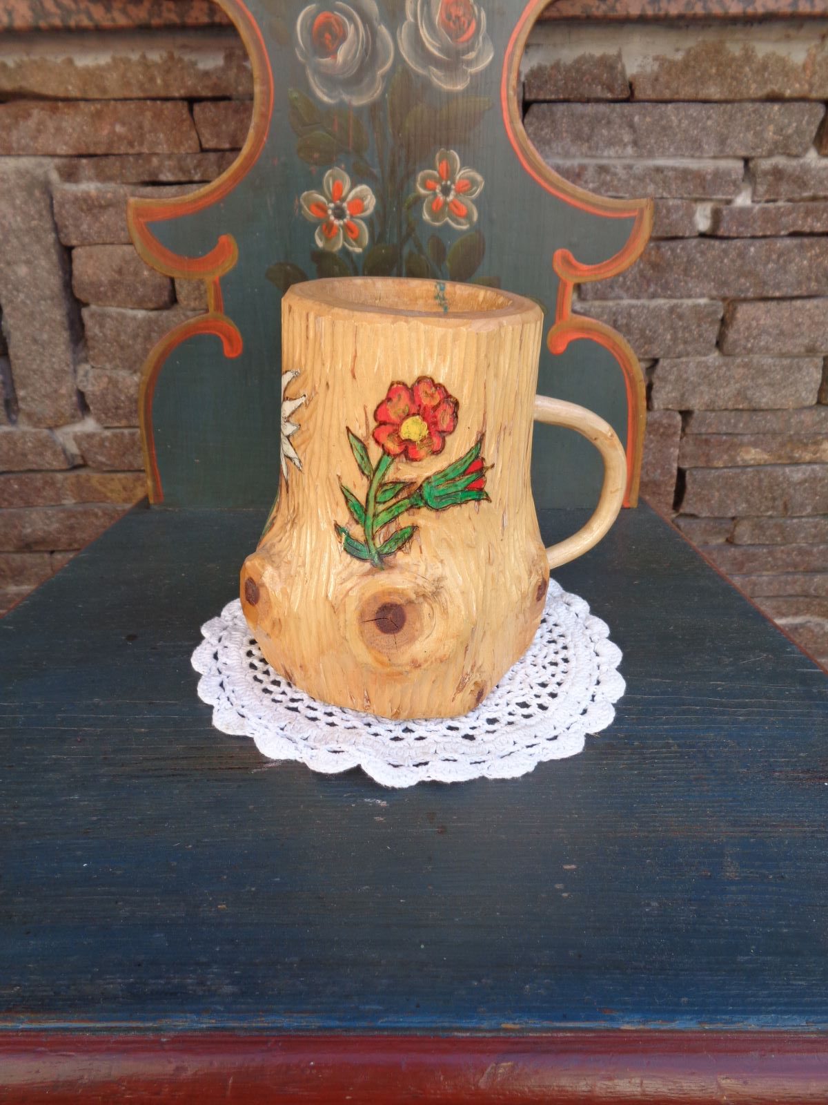 Grazioso boccale, realizzato in legno intagliato e poi dipinto con motivi della montagna.