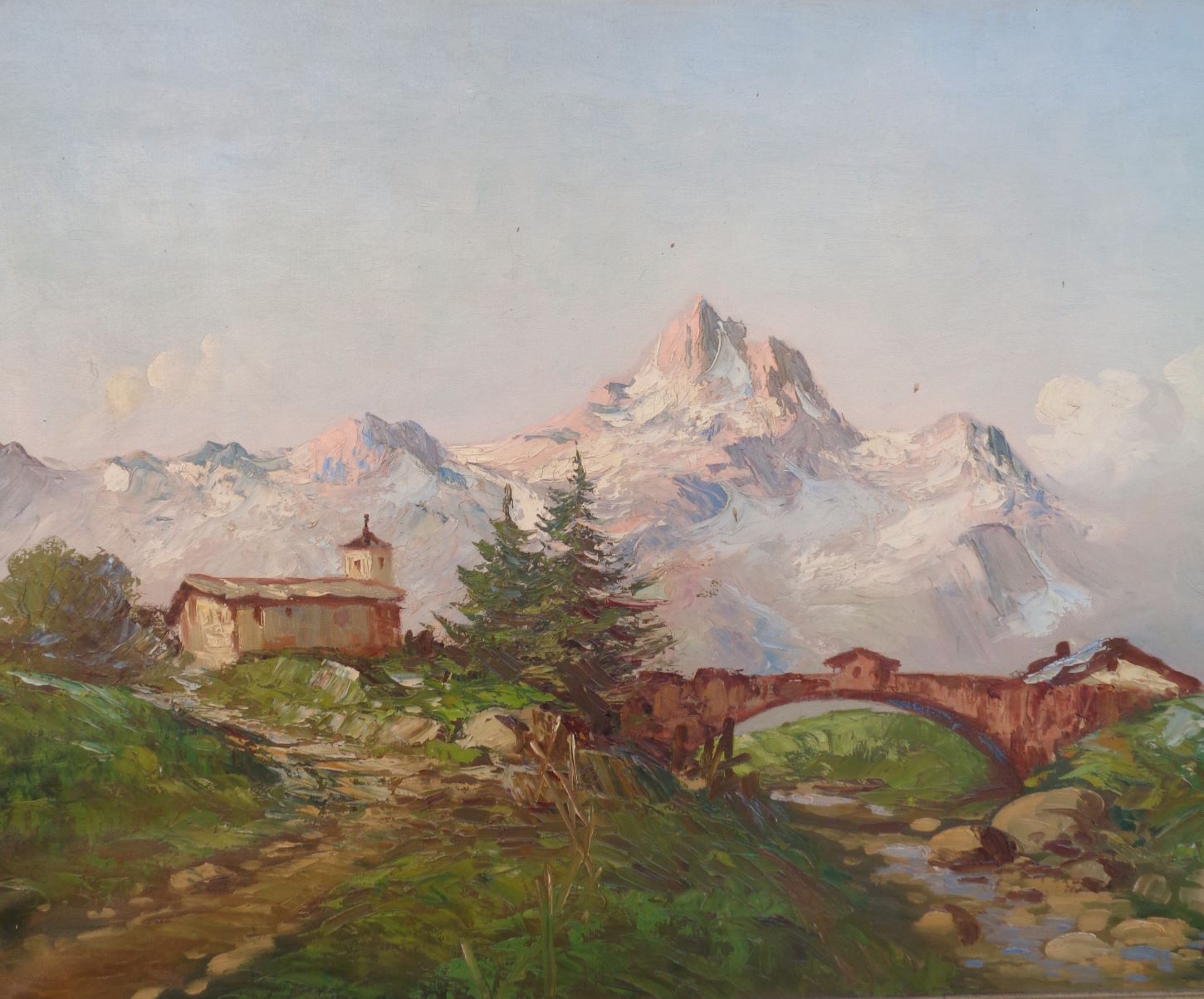 Elegante dipinto alpino, di grandi dimensioni, raffigurante veduta valdostana.
