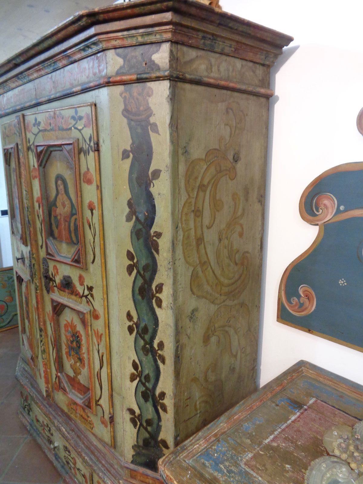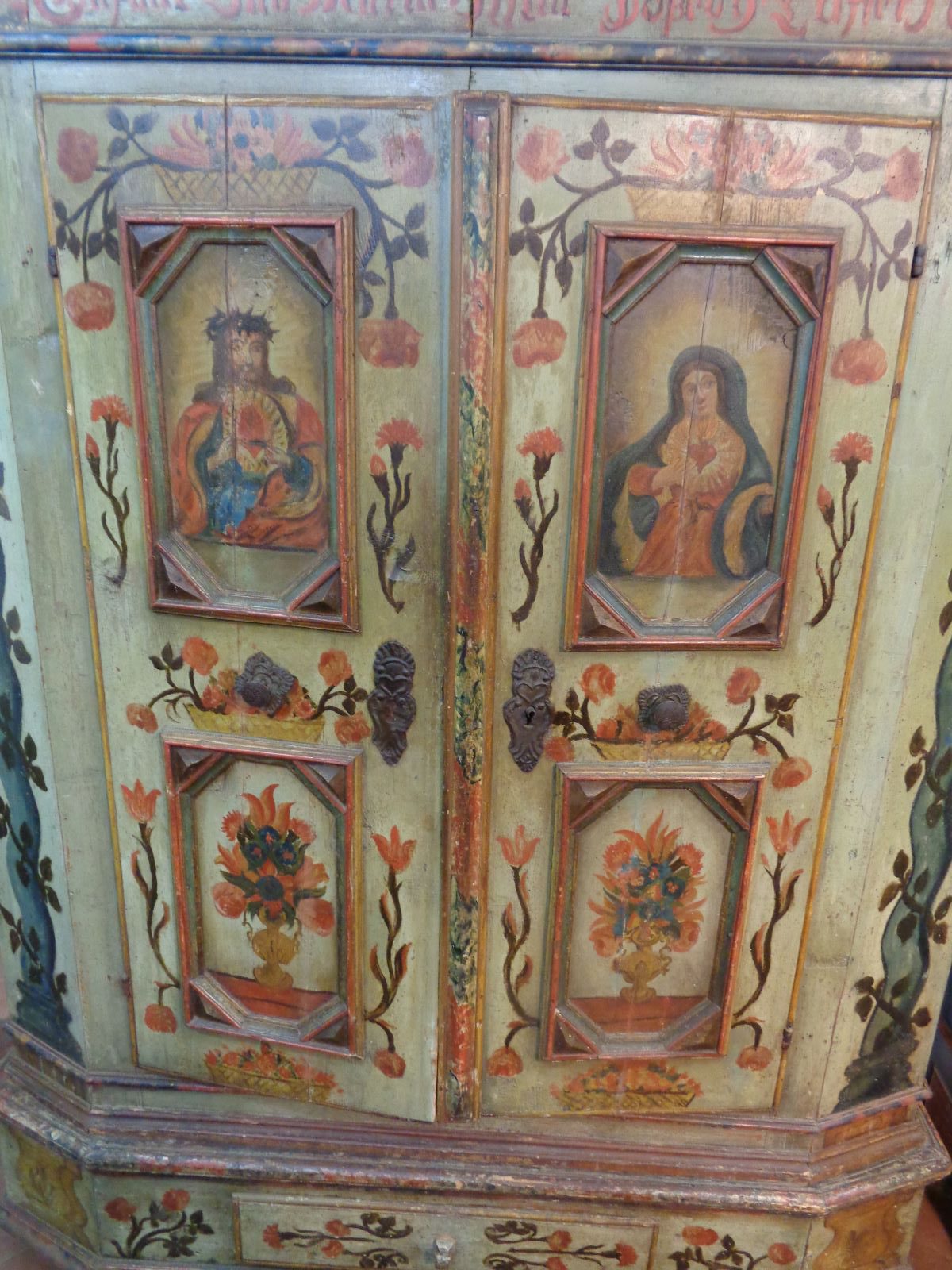 Importante armadio del Tirolo, riccamente decorato. Fronte a due ante dipinte con motivi floreali beneauguranti e motivi religiosi apotropaici, rappresentativi di un forte sentimento religioso e spirituale nelle popolazioni locali del tempo. La scantonatura frontale รจ dipinta con colonne a torciglione, come pure il finto cassetto in basso sempre decorato a fiori. Fianchi dipinti a motivi vari. Ferramenta coeva.