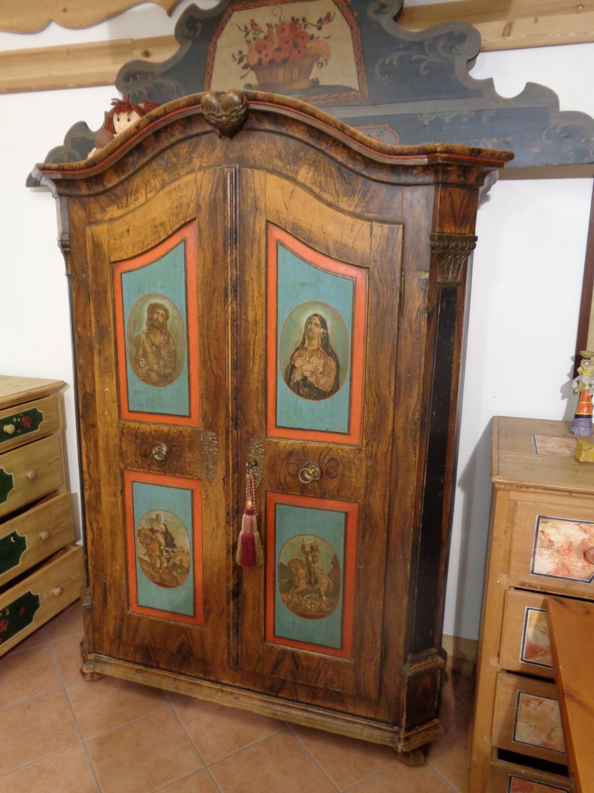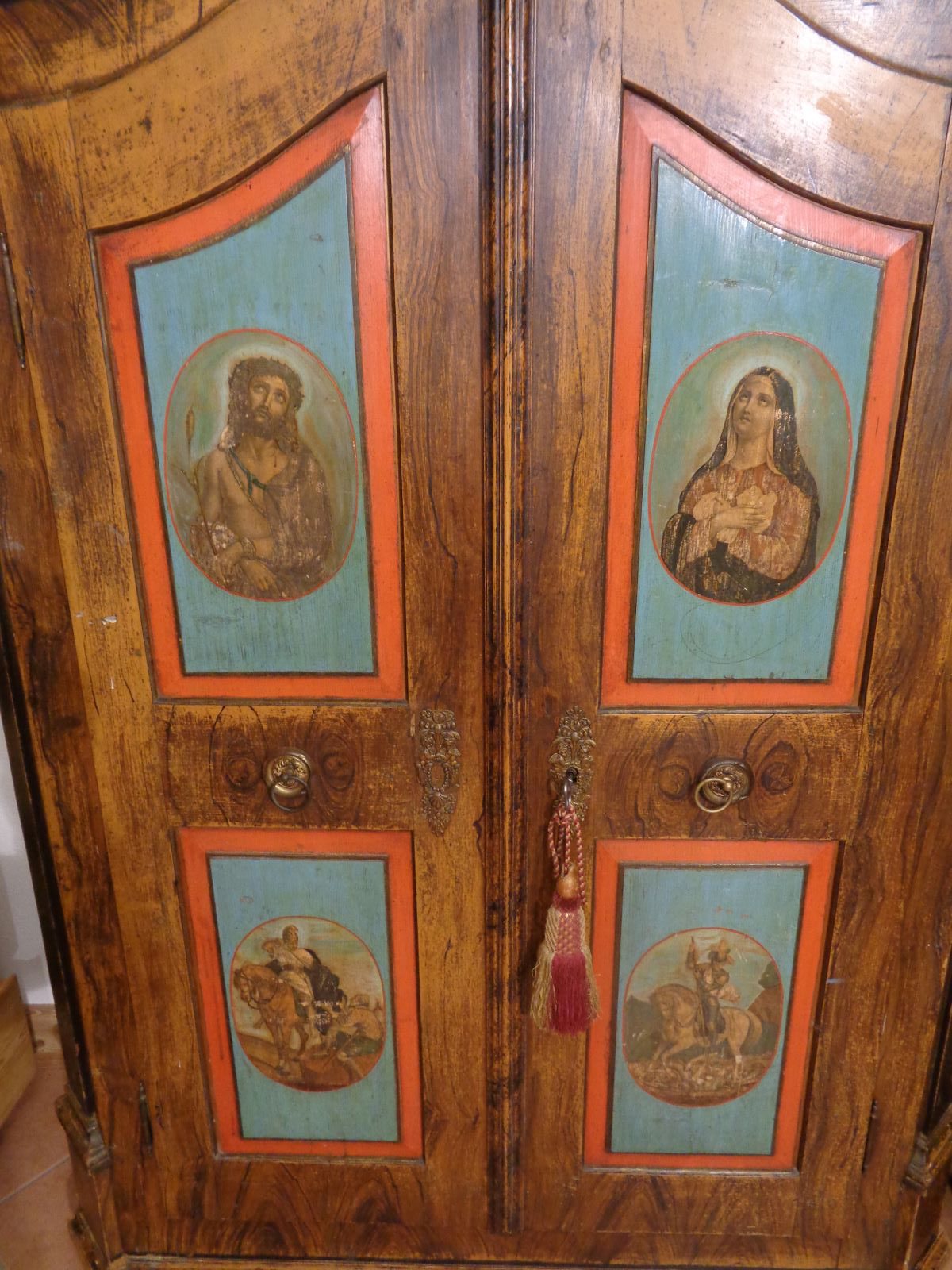 Raro armadio a due ante con lesene frontali ed  Sacro cuore scolpito  sul cappello mosso. La particolarità di questo mobile sta  nei riquadri delle  antine dove al posto delle decorazioni normali, vi sono delle incisioni di santi  su carta applicate, ridipinte a mano sopra. Interno con divisoria, cassetto e ripiani. Ferramenta coeva.