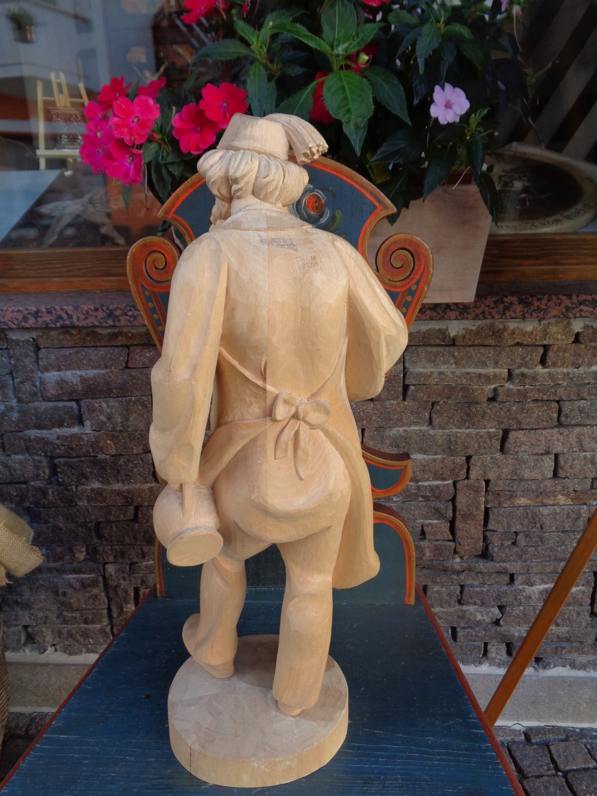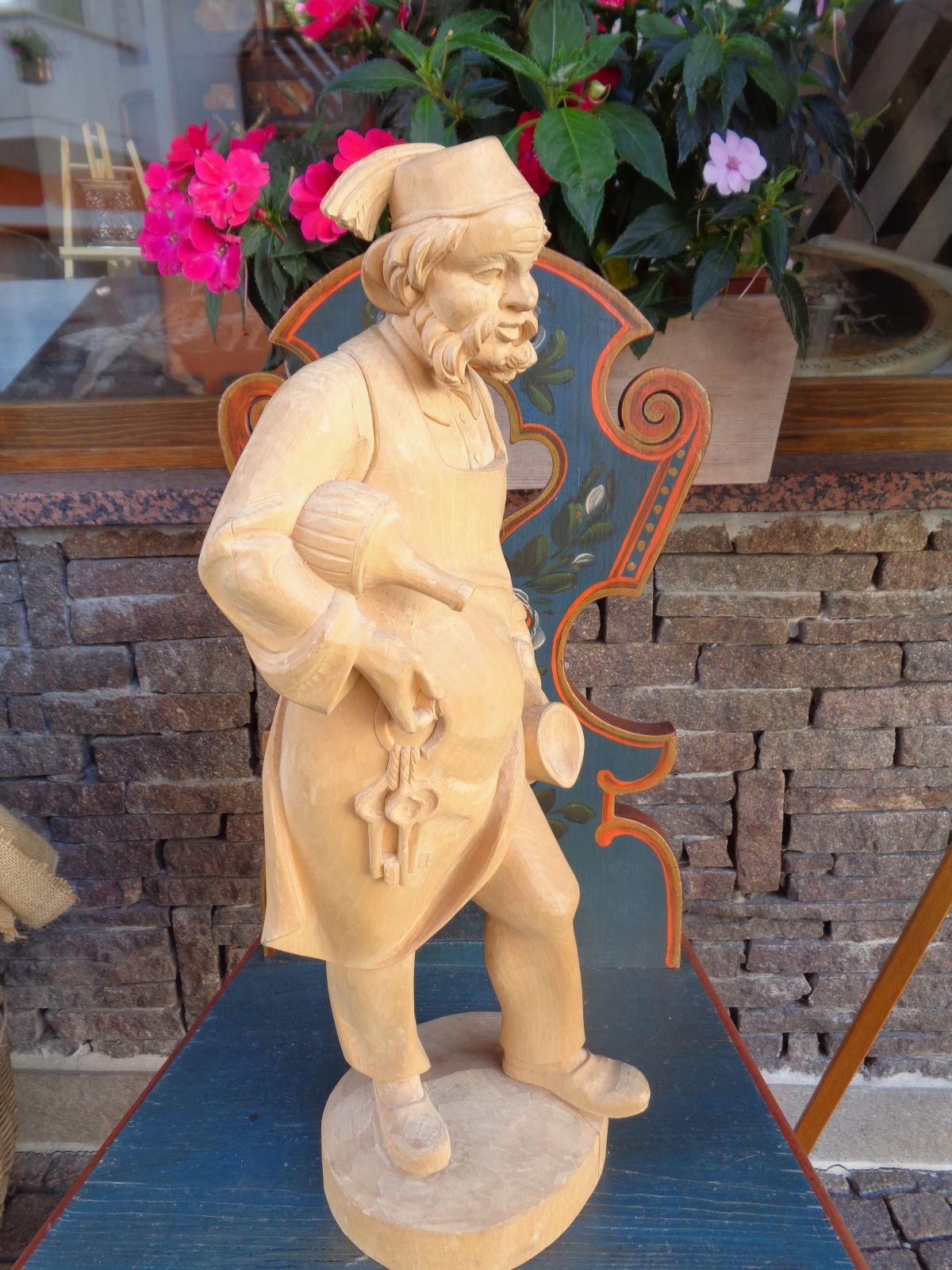 Vi presentiamo la classica figura dell’ oste Tirolese. Nella tradizione gardenese, raffigurato con le chiavi in mano e il fiasco del vino, a rappresentare l’ ospitalità e l’ accoglienza. Scultura ben realizzata e rifinita nei minimi particolari.
