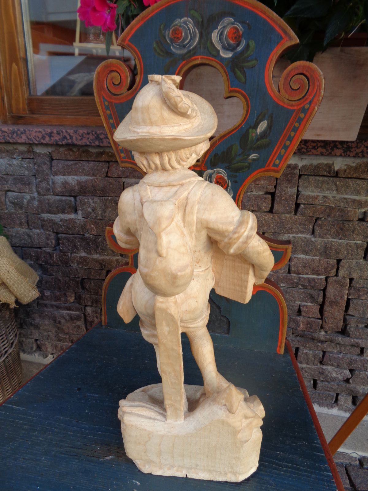 Caratteristica scultura della tradizione Ladino – Gardenese, nella veste del suonatore, (portatore di gioia ed allegria). Realizzata con cura e dovizia di particolari, dai maestri scultori della val Gardena.