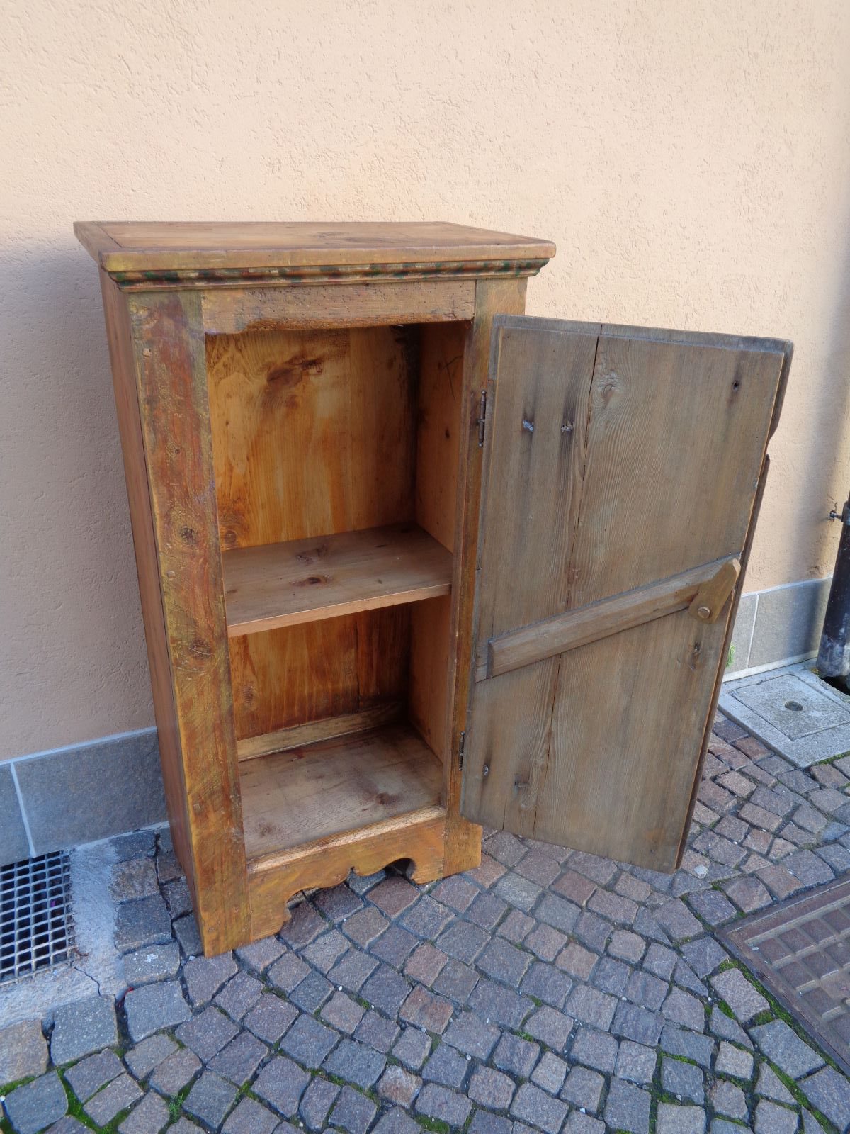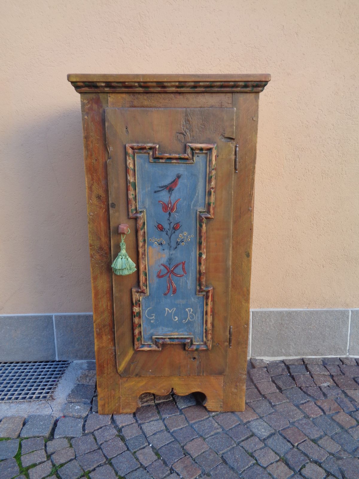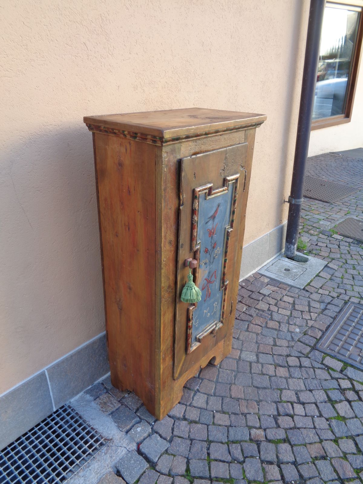 Rara credenzina Tirolese, dalle dimensioni contenute. Fronte ad una antina con cornici spezzate e decorata a motivi floreali. Interno con ripiano.