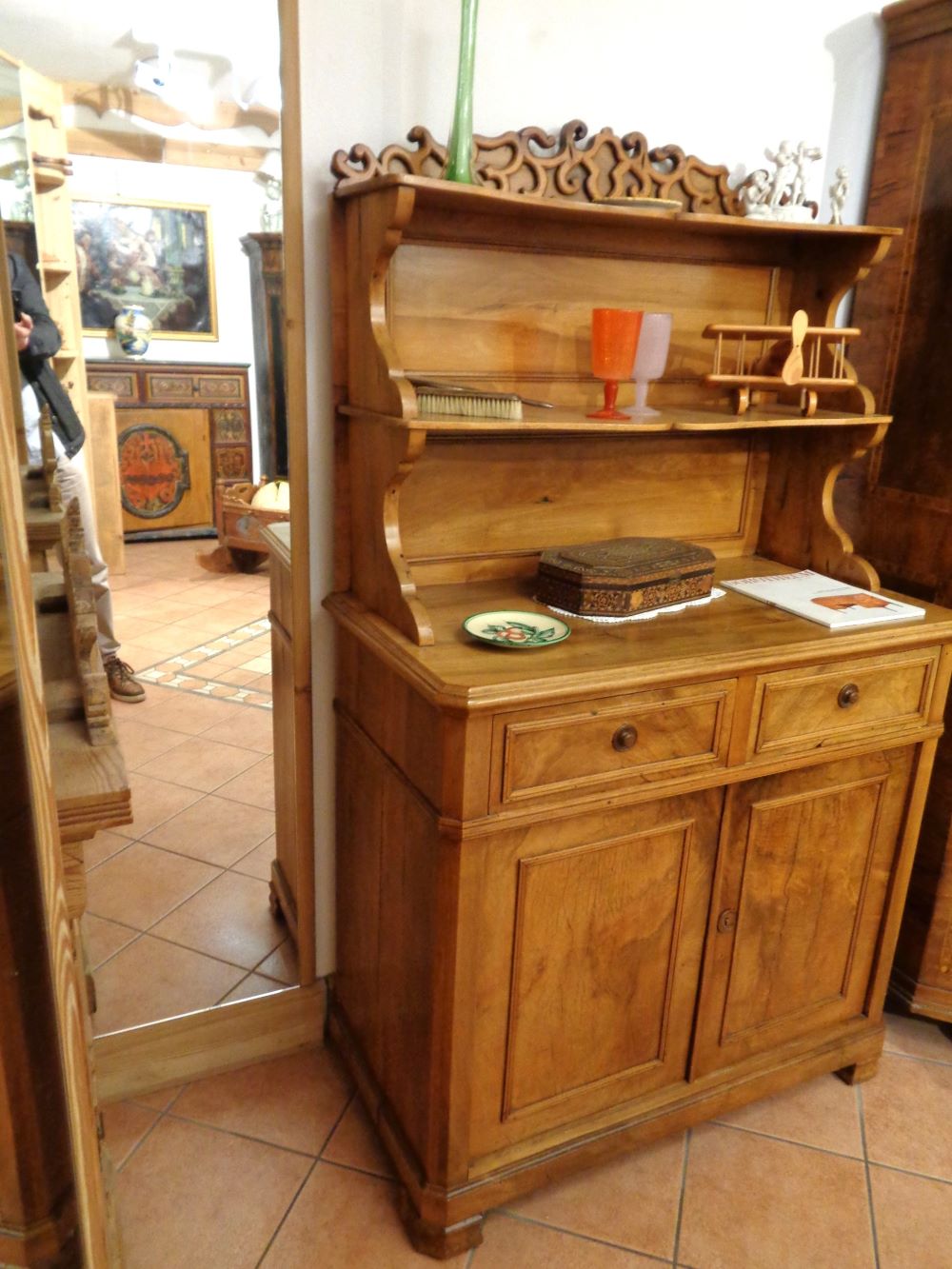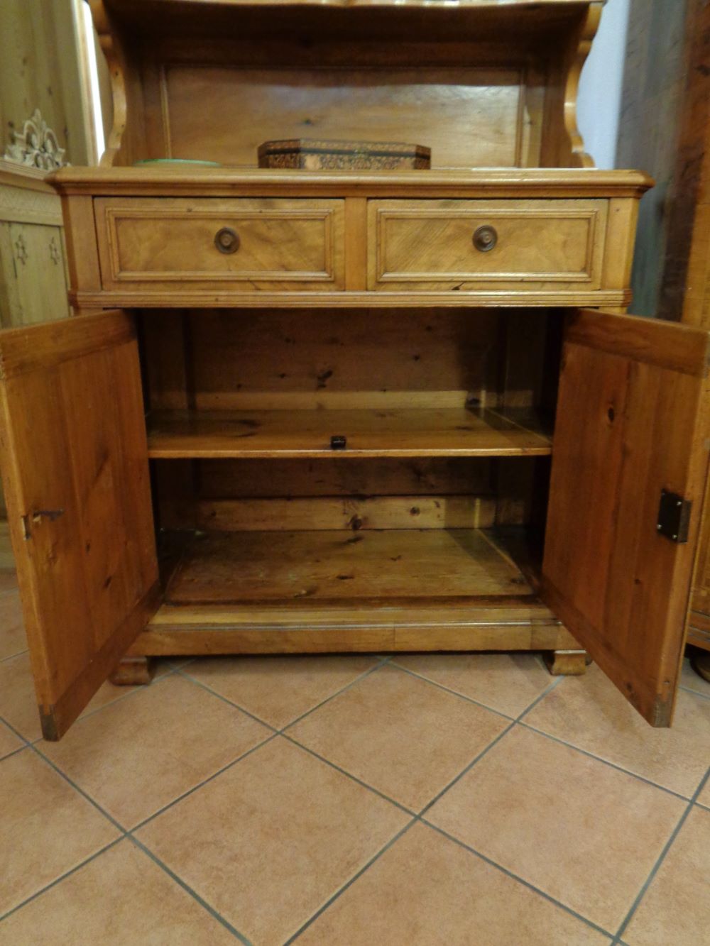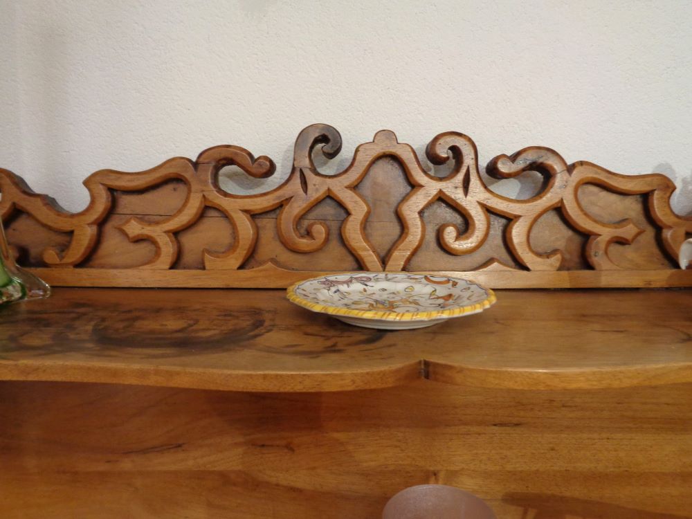 Piccola credenza a due antine, con alzata a ripiani con cimasa intagliata a mano. Interno con ripiano.