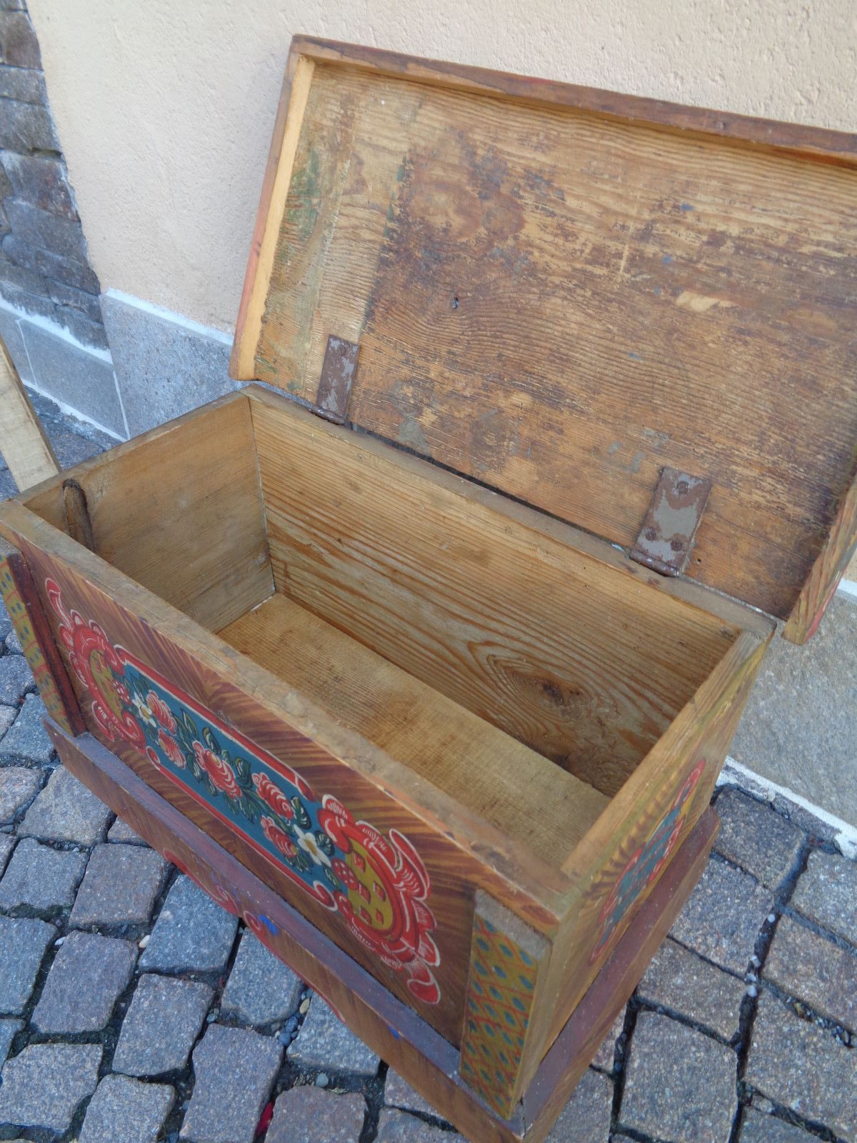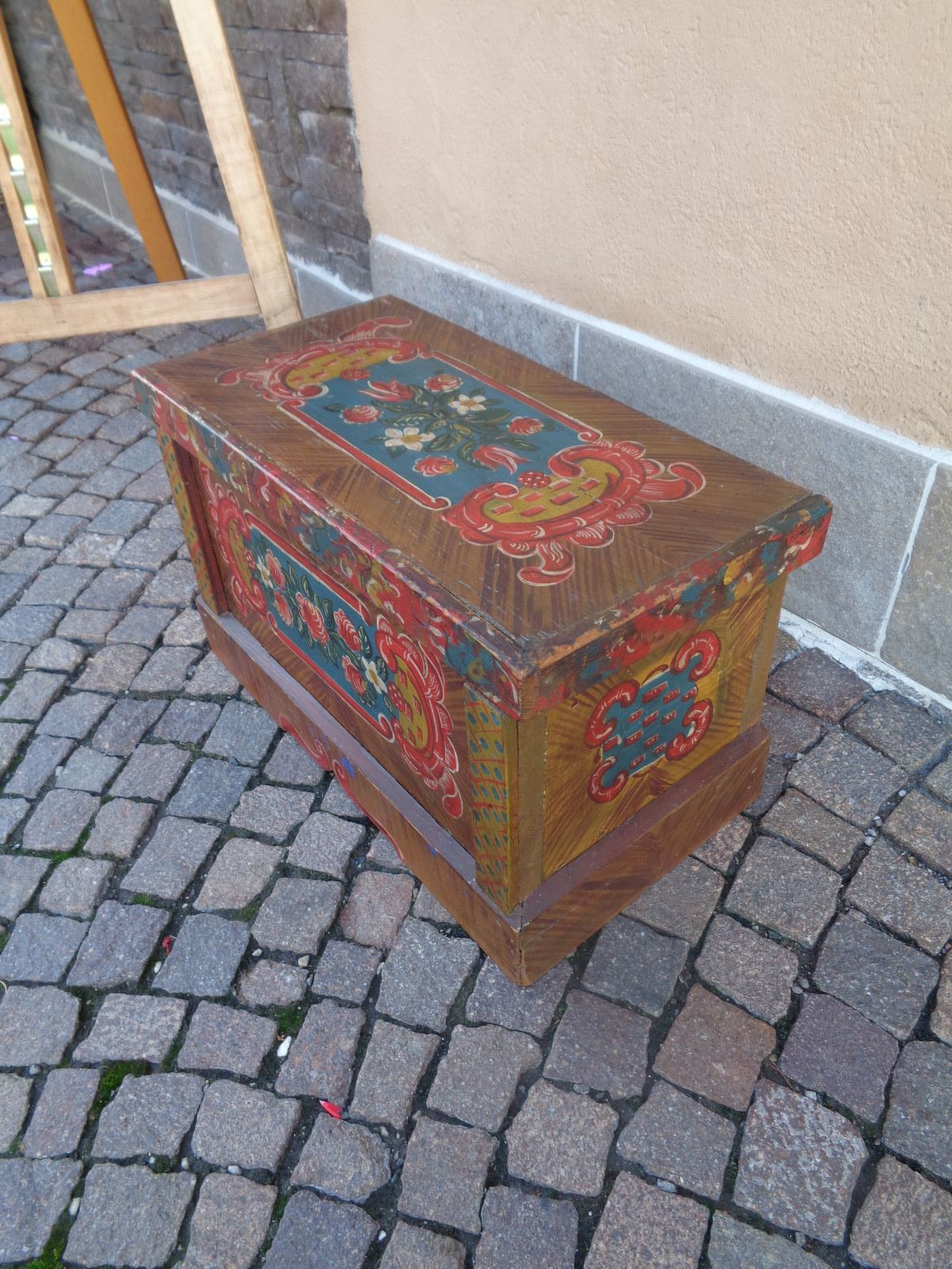Graziosa piccola cassapanca, completamente decorata,  con varie decorazioni floreali. Questa tipologia di mobiletti veniva normalmente adibita al contenimento di piccoli oggetti di uso pratico per la casa.