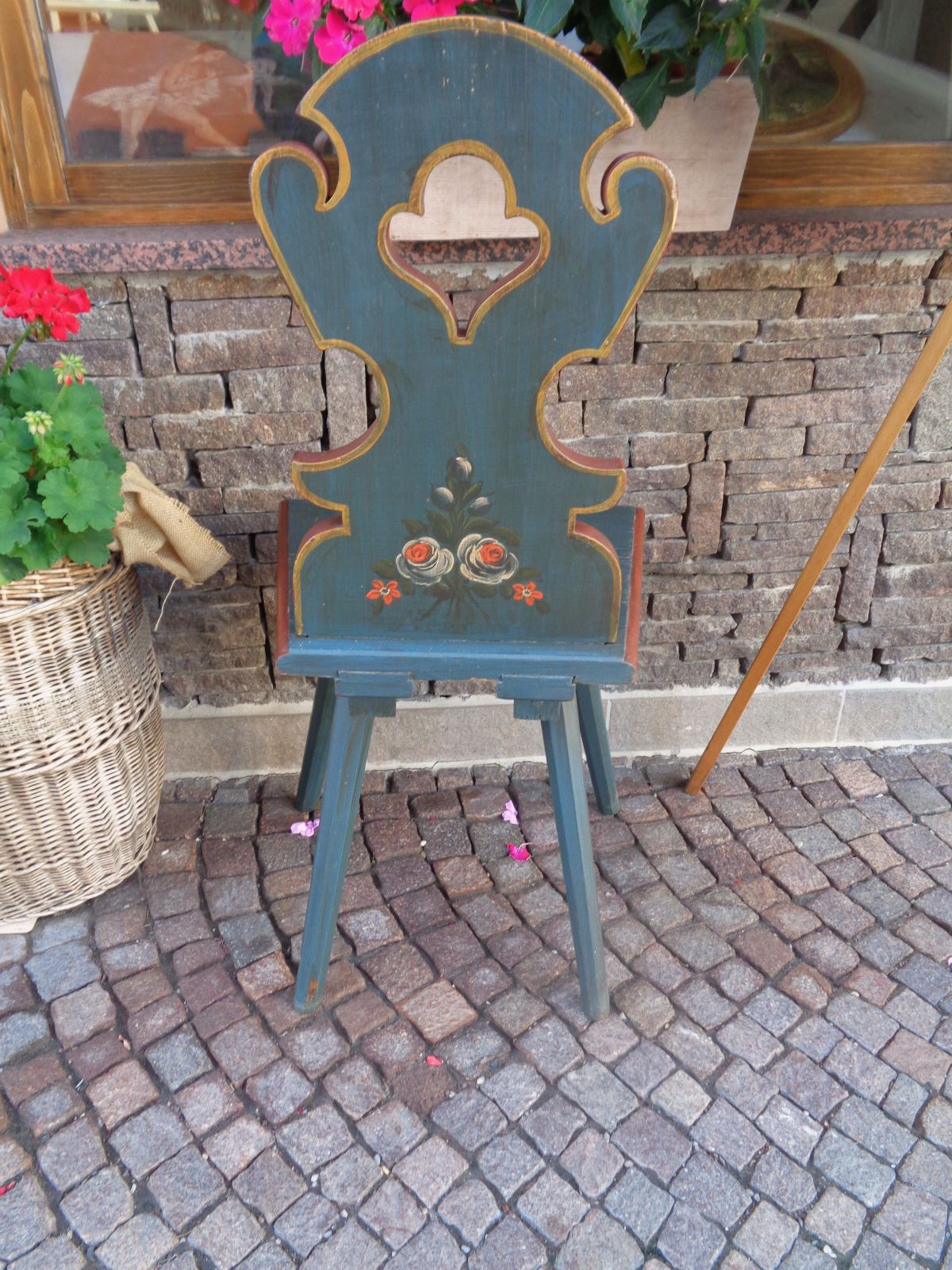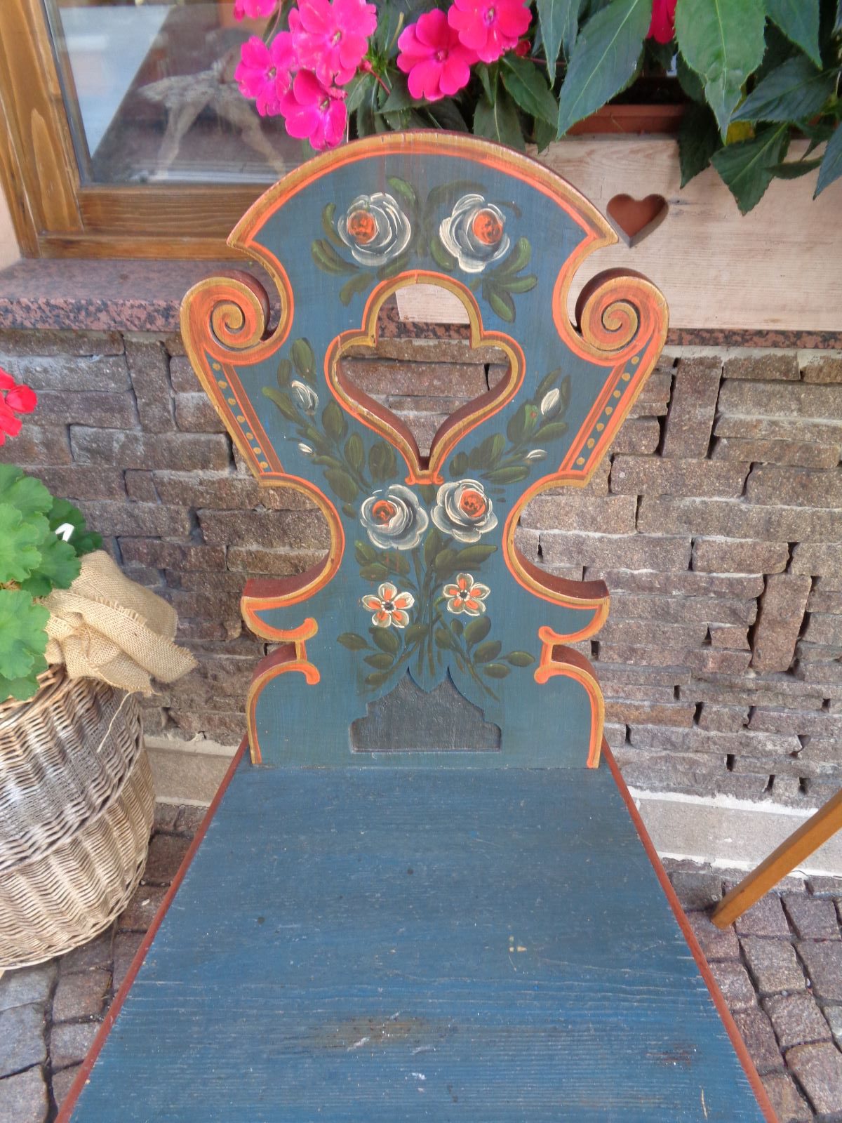 Pregiata sedia tirolese dipinta, con schienale intagliato e decorato a motivi floreali.