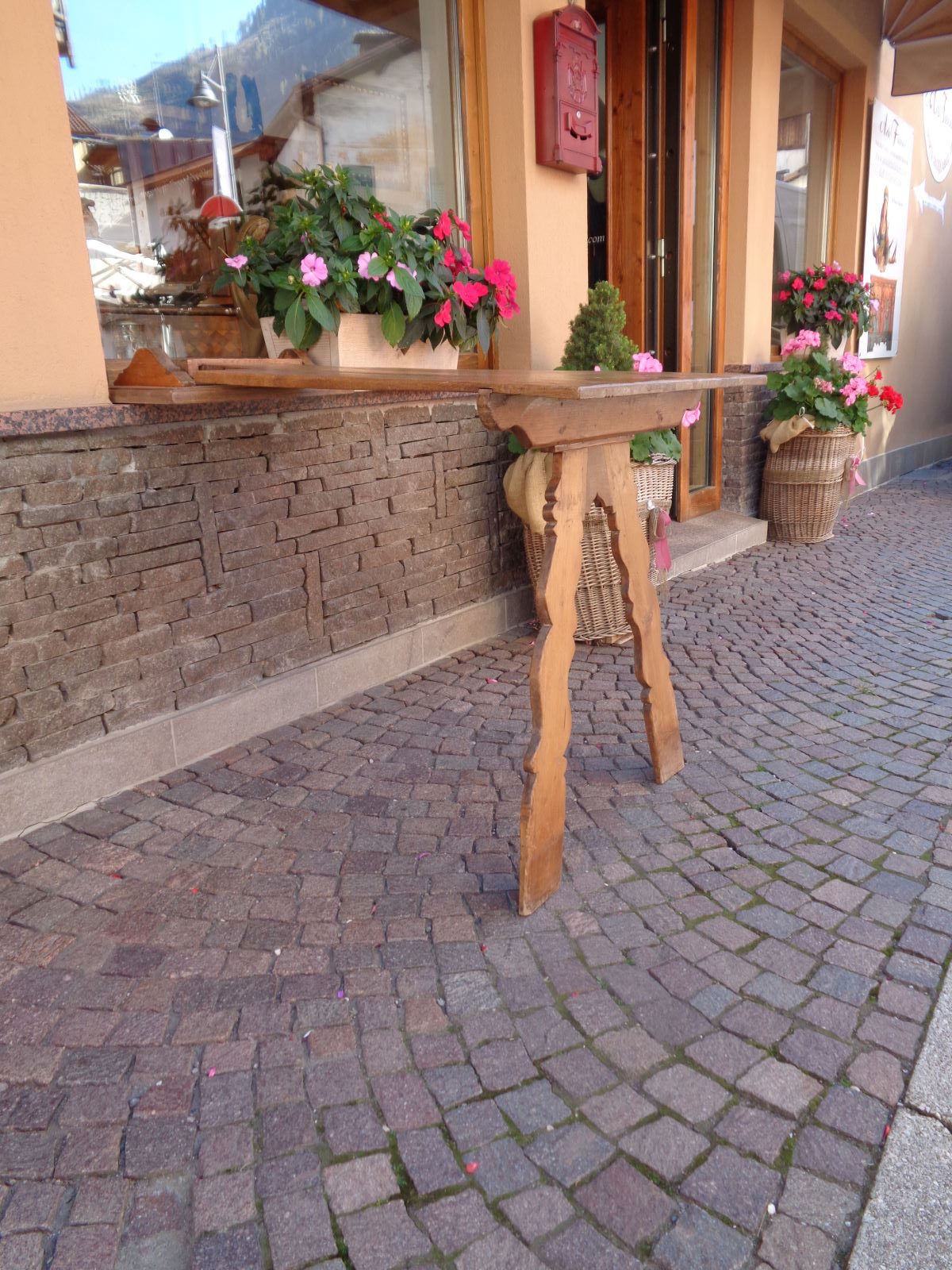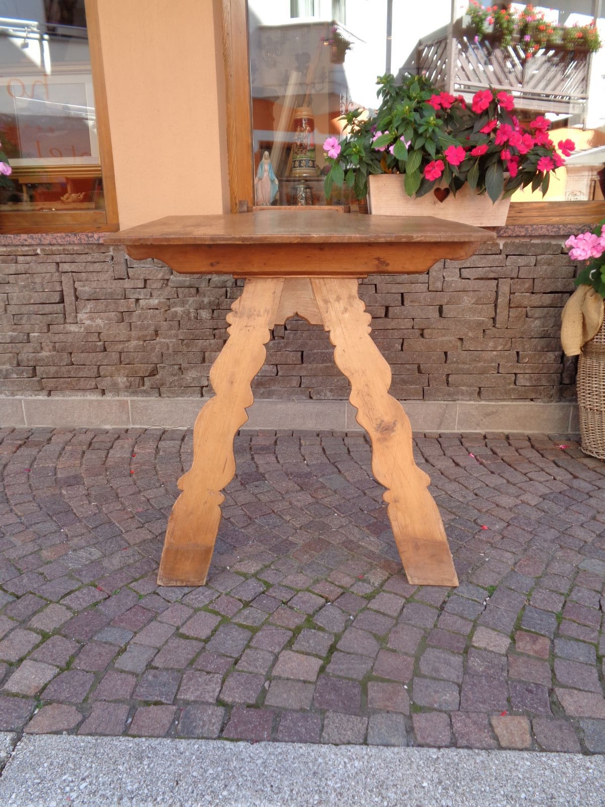 Raro tavolo tirolese da parete, realizzato in legno con supporti coevi. Questa tipologia di tavoli pieghevoli erano sovente utilizzati per lavori manuali, nelle stubi tirolesi affiancandosi al tavolo principale.