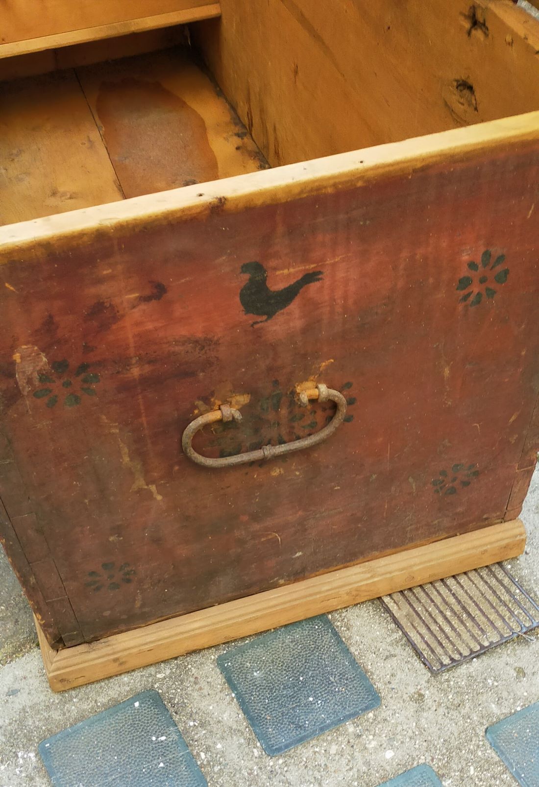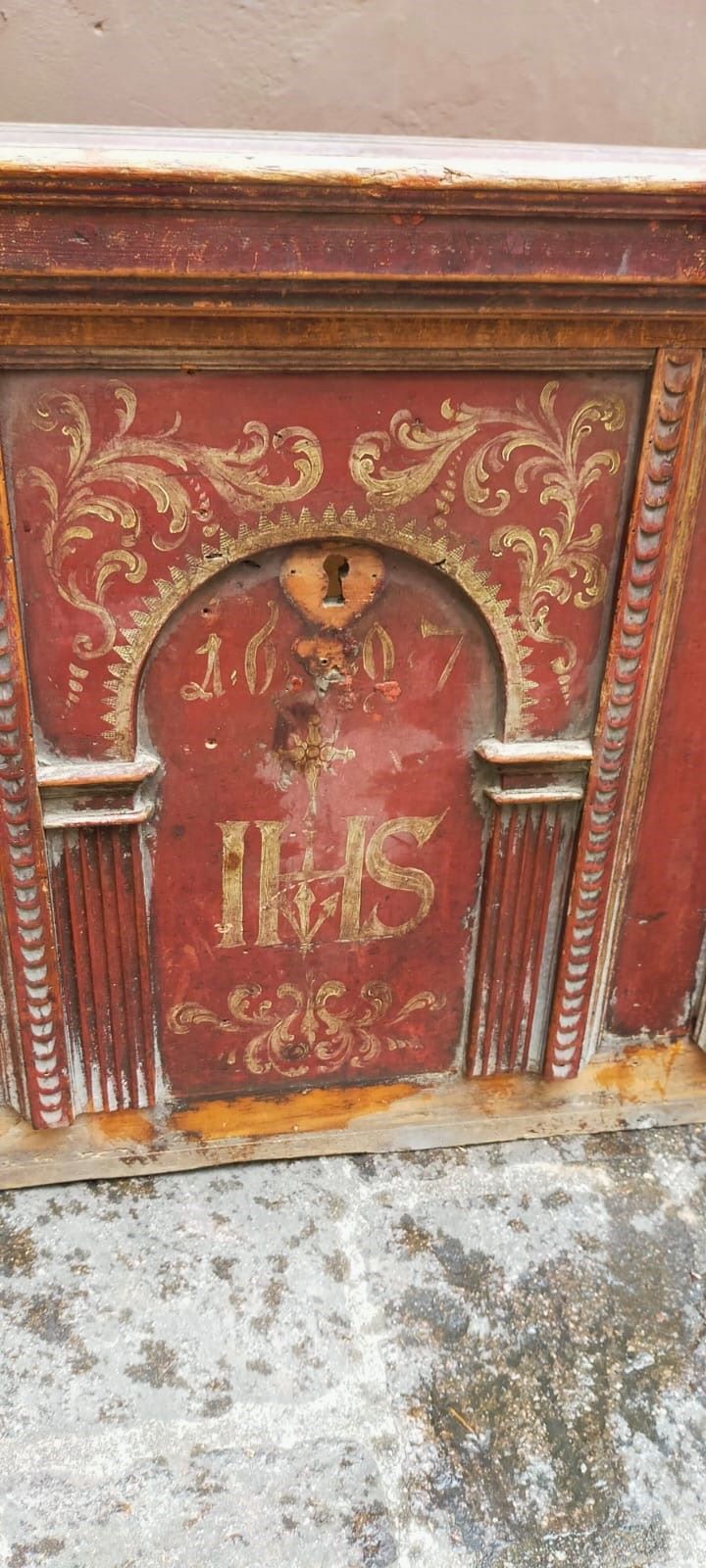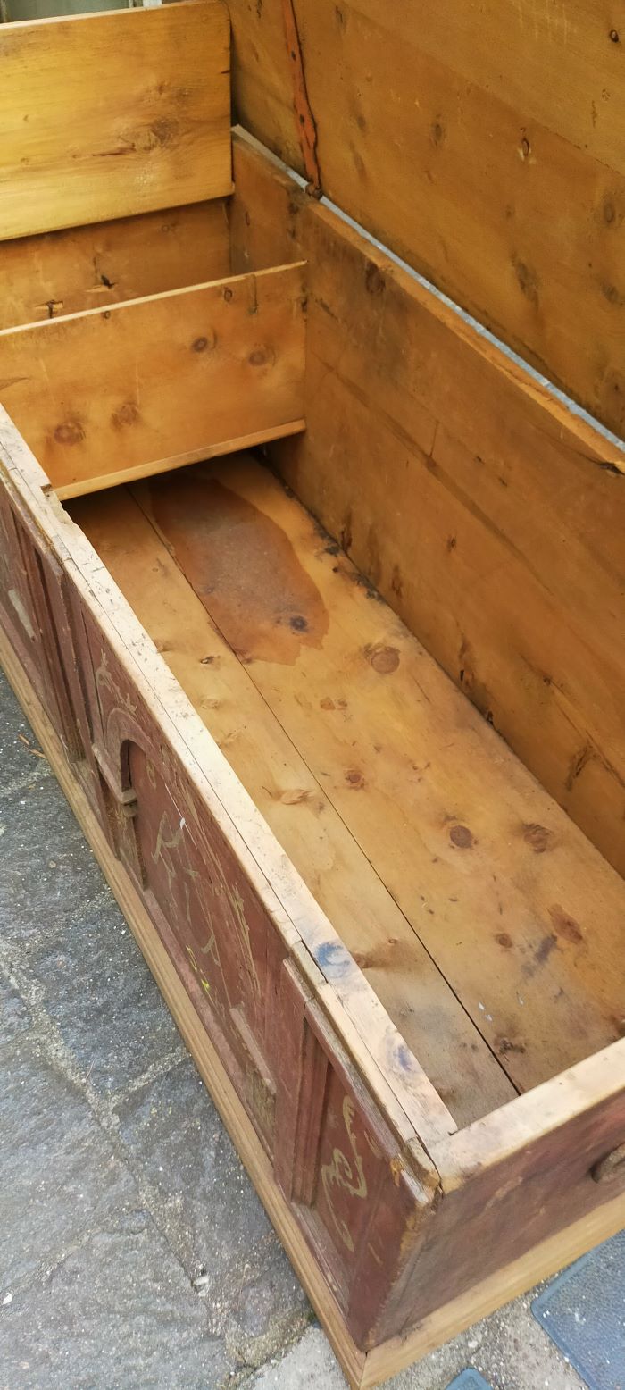 Pregiata cassapanca finemente decorata a motivi religiosi beneauguranti ed apotropaici.